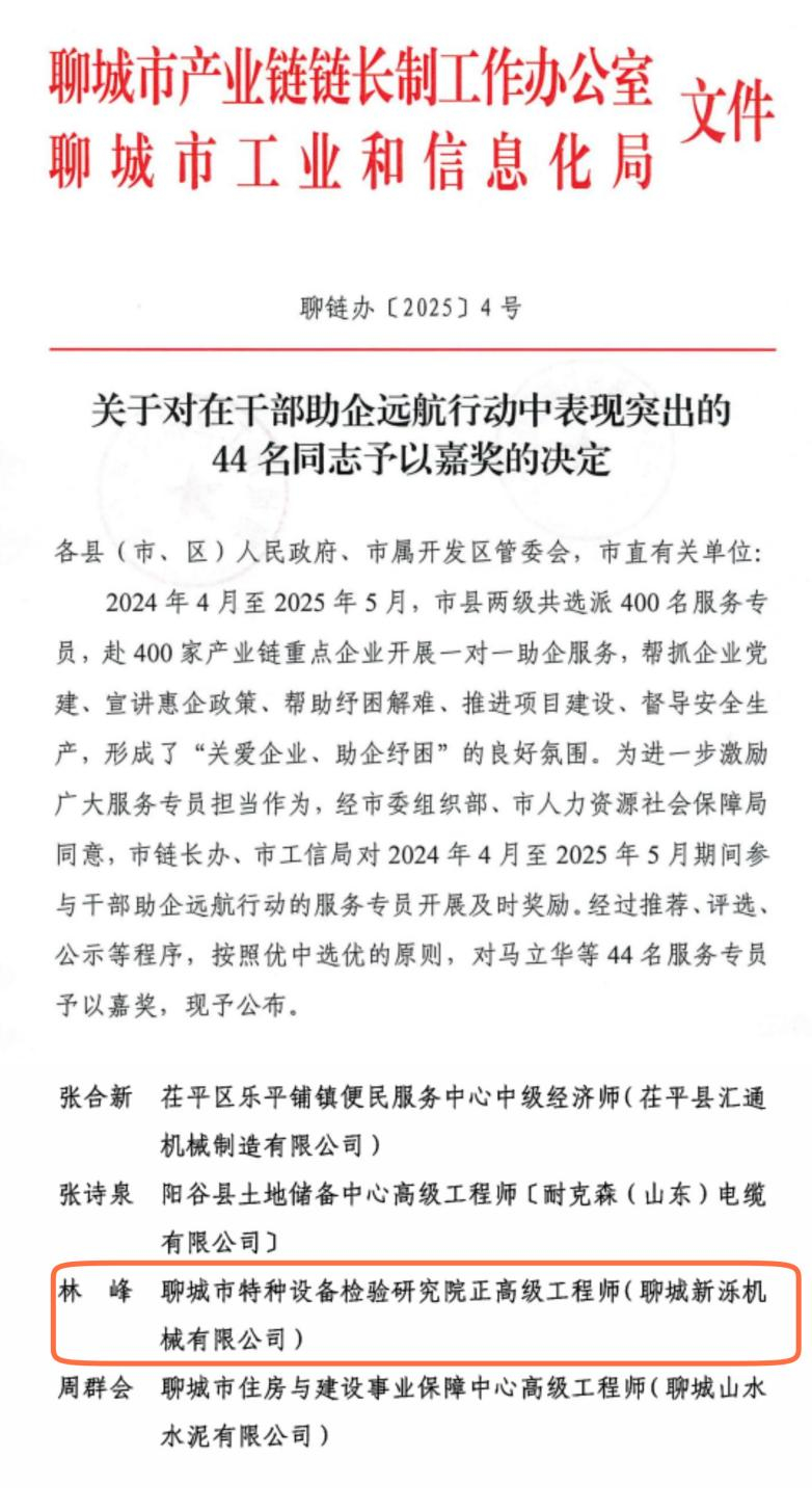 近日,聊城市特檢院林峰同志在全市干部助企遠航行動中表現突出,獲頒嘉獎榮譽。