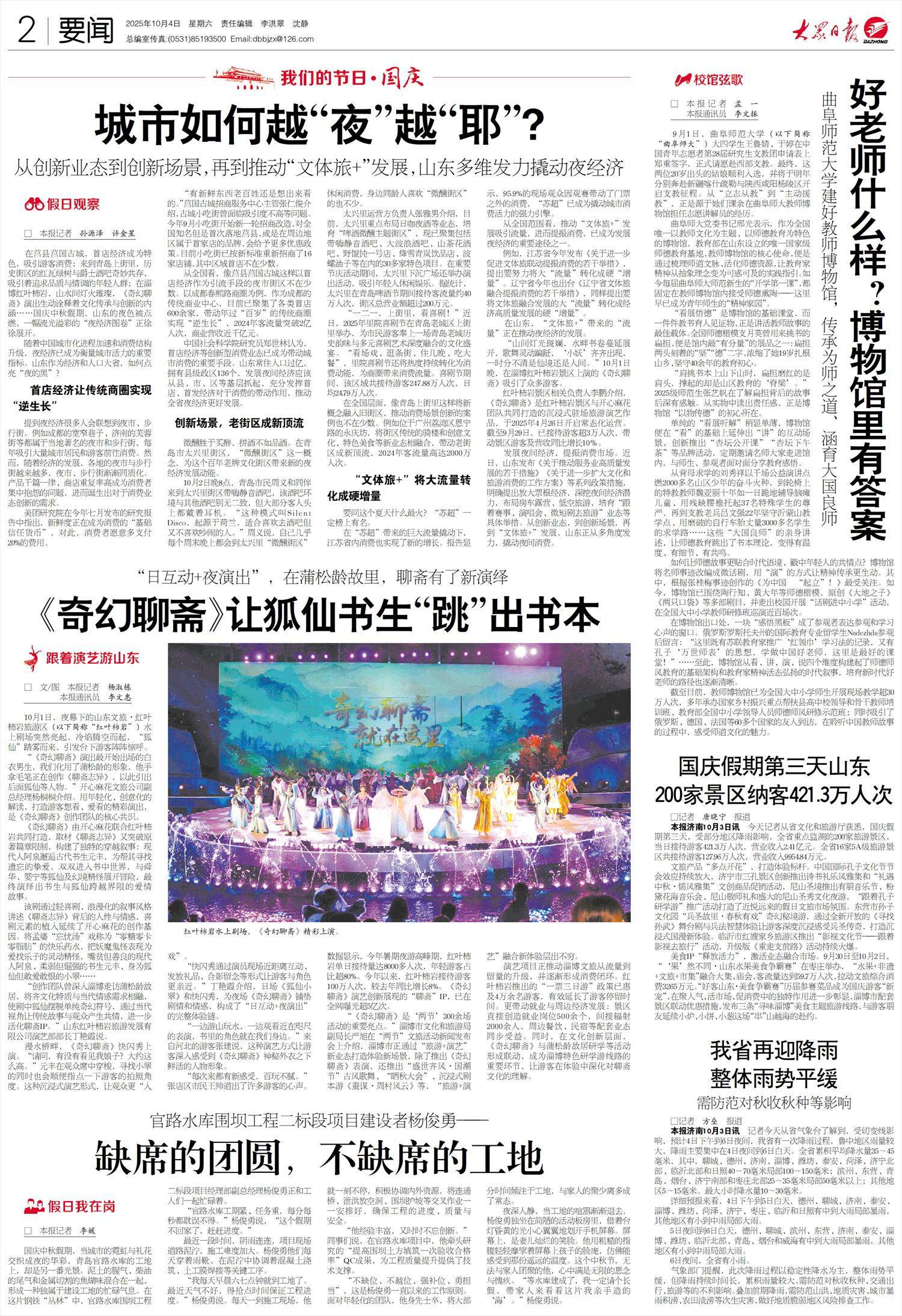 在莒縣莒國古城,首店經濟成為特色,吸引游客消費;來到青島上街里,歷史街區的紅瓦綠樹與爵士酒吧奇妙共存,吸引著追求品質與情調的年輕人群;在淄博紅葉柿巖,山水間燈火璀璨,《奇幻聊齋》演出生動詮釋著文化傳承與創新的內涵……國慶中秋假期,山東的夜色被點燃,一幅流光溢彩的“夜經濟圖卷”正徐徐展開。