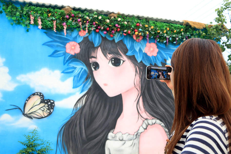 游客在興隆村內的手繪墻打卡拍照