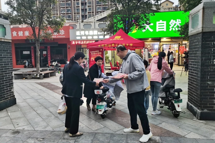 在龍灣小區活動現場,工作人員向居民發放宣傳頁。張立凱 攝